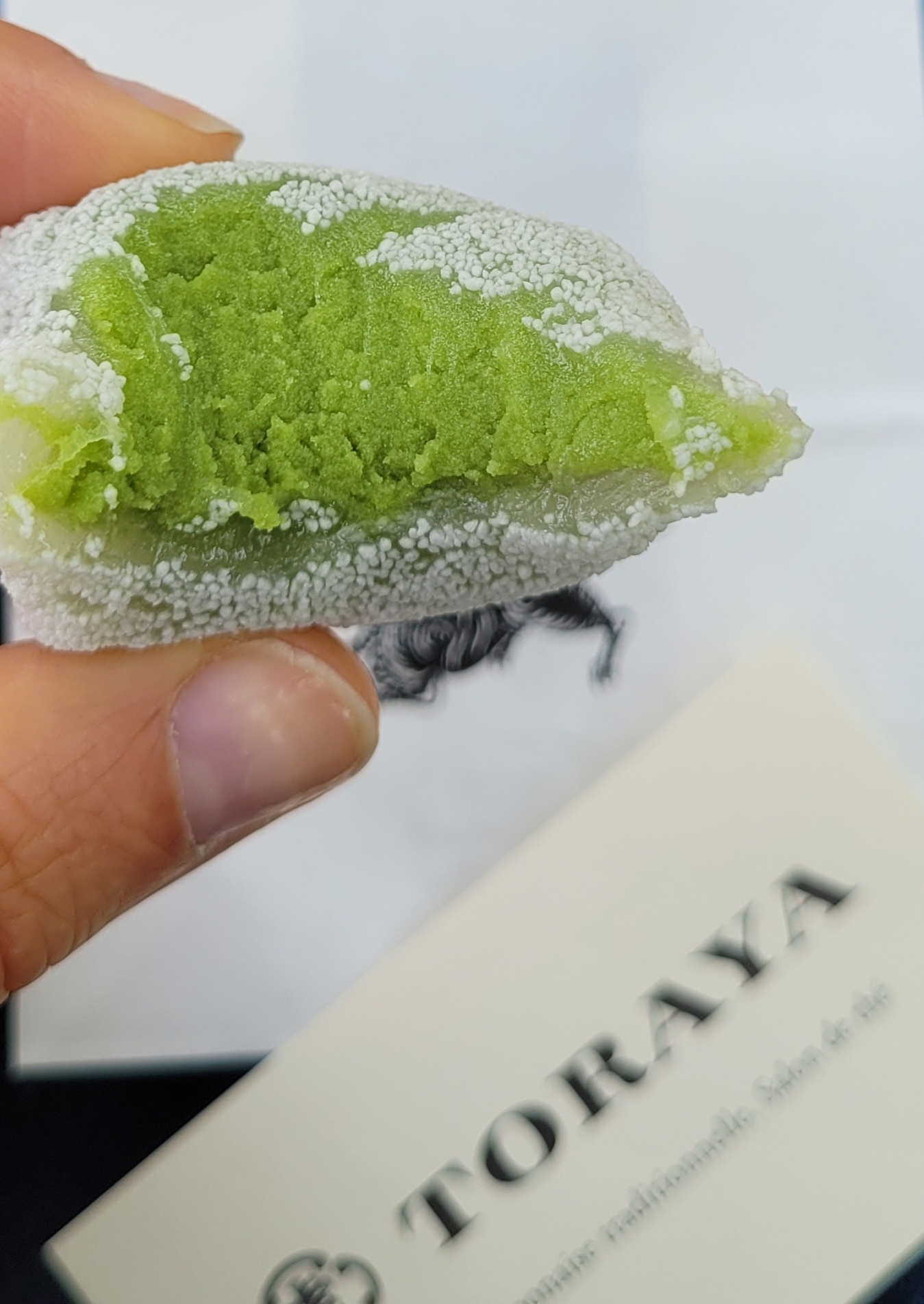 Excellent Daifuku (mochi) gâteau de riz fourré a la pâte d'haricot blanc+ matcha, quasi pas sucré, délicat, fondant, ambiance sereine apaisante. Je recommande.